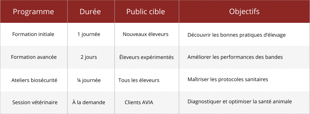 Les Couvoirs AVIA proposent des sessions adaptées à chaque profil d’éleveur, pour maîtriser les bonnes pratiques, améliorer les performances et garantir une biosécurité optimale tout au long de la production.